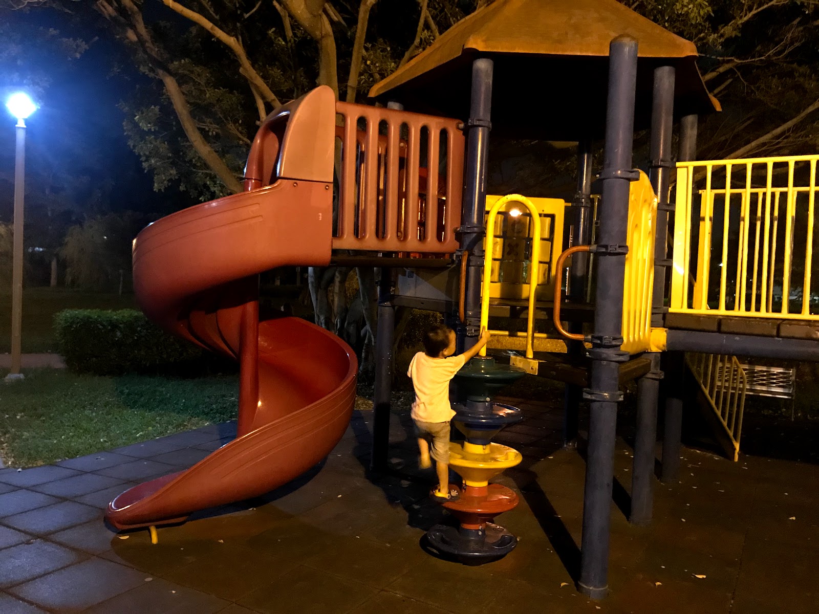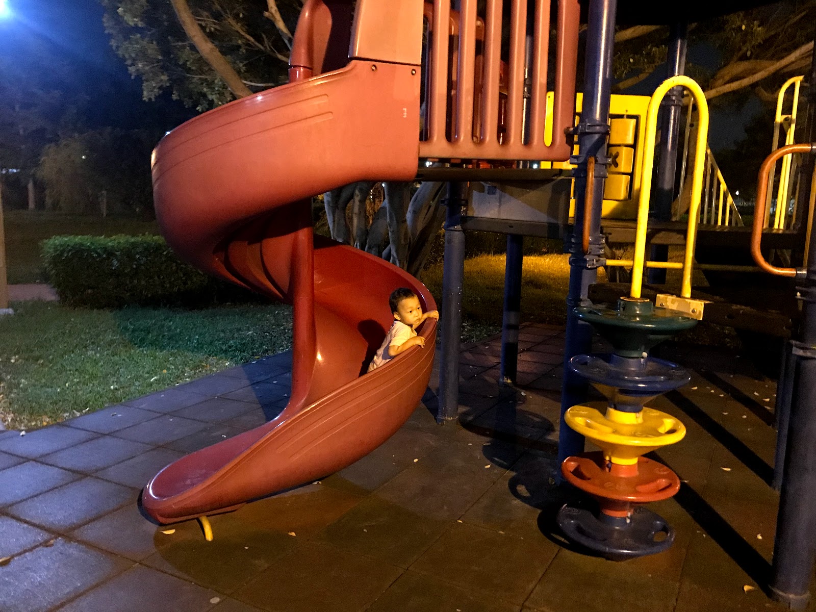 幸好這溜滑梯寬度夠我和他一起溜下去,
